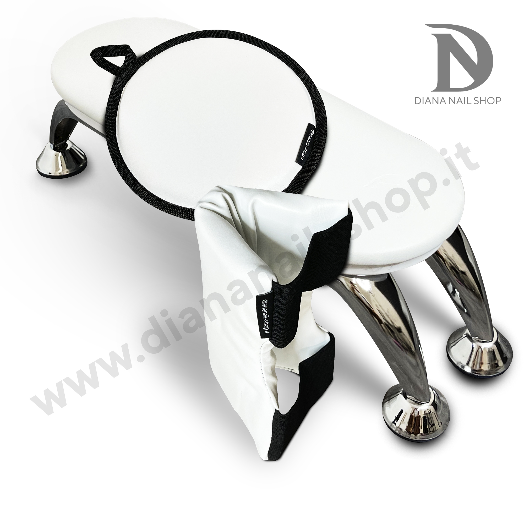 Poggiabraccio unico: alto, quindi ottimo per ridurre la curvatura dell’onicotecnica e aiutare la cliente a stare nella giusta posizione; spazioso, può stare a cavallo di due lampade (tipo futura e simili) e quindi ottimizza gli spazi sui tavolini da lavoro, spesso troppo piccoli; creato in materiali di alta qualità, ecopelle e struttura in legno e acciaio inox cromato.