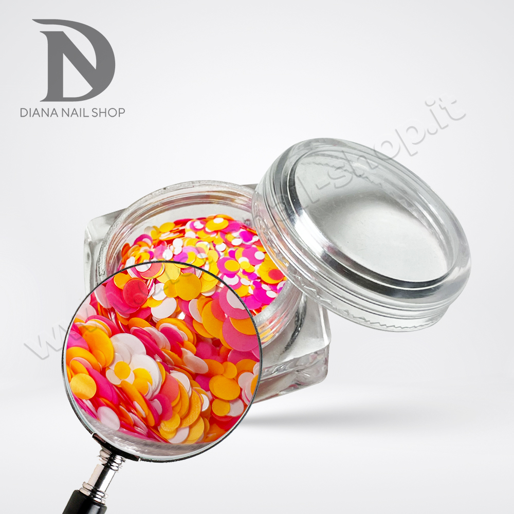 Pailettes rotonde di diverse misure 1mm, 2mm e 3mm, sottili e facili da usare, ad alto impatto visivo.